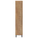 This tall shoe cabinet combines modern industrial design with practical functionality, featuring a natural oak finish and four metal mesh-framed doors for ventilation. Designed to organize your footwear collection, it includes 14 adjustable shelves, accommodating a variety of shoe sizes and styles. An off-centered vertical divider adds visual interest and easy categorization. Crafted from engineered wood with a scratch-resistant laminate finish, the cabinet is supported by sturdy black metal legs. A stylish and organized solution for entryways, closets, or bedrooms.