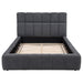 Tailored with bold lines and soft texture, this upholstered platform bed blends comfort with quiet strength. Vertical channel tufting runs along the headboard and foot rails, adding dimension and rhythm to the silhouette. Wrapped in plush fabric and fully slatted for support, it eliminates the need for a foundation. Crafted from solid and engineered wood, this bed invites modern serenity into any bedroom retreat.
