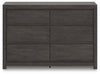 Details Made with engineered wood (MDF/particleboard/plywood) and decorative laminate for the right balance of affordability and durability, Dark charcoal finish over replicated oak grain, Decorative laminate replicates natural or man-made material surfaces with consistent color, pattern and texture, Recessed hand grabs create hardware-less effect, 6 smooth-gliding drawers, Drawer interiors are lined with a faux linen laminate for a clean, finished look, Safety is a top priority, clothing storage units are designed to meet the most current standard for stability, ASTM F 2057 (ASTM International), Drawers extend out to accommodate maximum access to drawer interior while maintaining safety, Assembly required