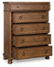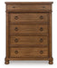 Taking a laid-back approach to casual traditional design, this artfully crafted chest of drawers combines classic elements with a clean modern approach. Its rich medium brown wood tone exudes a comfy, timeless appeal that's sure to carry you away to a dreamy time and place. Simple round metal knobs and ring pulls on the chest's spacious drawers make just the right statement.