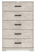 Give casual a new meaning with the chic look of the Shawburn chest of drawers. A light gray finish over replicated oak grain keeps it laid-back and inviting, while substantial pulls in a warm pewter tone add a modern farmhouse touch. Spacious drawers give you plenty of room to store your wardrobe. Talk about a delightfully relaxed vibe in your inner sanctum.