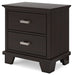 Feast your eyes on this richly versatile nightstand. Its traditional-inspired dark brown finish effortlessly blends with contemporary bright nickel-tone pulls to create a stunning look that's not too stuffy or too trendy. Spacious drawers offer plenty of room to tuck away your bedside must-haves.