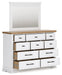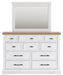 Details B844B5: Includes panel headboard, storage footboard, rails and roll slats, Footboard made with hardwood solids, MDF substrates and butcher block oak veneer, Headboard and rails made with hardwood solids and MDF substrates, White finish, Headboard with inset black metal barn sash, 2 drawers in footboard with fully finished interior, dovetail construction and ball-bearing side glides, Pulls with matte black finish, Bed does not require a foundation/box spring, Mattress available, sold separately, Assembly required, B844B1: Includes dresser and mirror, Made with hardwood solids, MDF substrates and butcher block oak veneer, Dresser with 2-tone finish (white finish; butcher block oak veneer with natural finish), Pulls with matte black finish, 10 spacious drawers with fully finished interiors (top drawers felt lined), dovetail construction and ball-bearing side glides , Drawers with inset picture fronts, Mirror attaches to back of dresser, B844-46: Made with hardwood solids, MDF substrates and butcher block oak veneer, 2-tone finish (white finish; butcher block oak veneer with natural finish), Pulls with matte black finish, 5 spacious drawers with fully finished interiors (top drawers felt lined), dovetail construction and ball-bearing side glides, Drawers with inset picture frame fronts, B844-93: Made with hardwood solids, MDF substrates and butcher block oak veneer, 2-tone finish (white finish; butcher block oak veneer with natural finish), Pulls with matte black finish, 3 spacious drawers with fully finished interiors (top drawers felt lined), dovetail construction and ball-bearing side glides, 110V power supply with dual USB charging ports, Power cord included; UL Listed, Drawers with inset picture frame fronts,