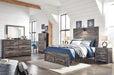 This full-size panel bed with storage, dresser and mirror is a refined take on barn board beauty. Its complex, replicated wood grain showcases hints of burnt orange and teal tones for a sense of weatherworn authenticity. The dresser with six smooth-gliding drawers lined with faux linen laminate and industrial dark-tone hardware complete this rustic and industrial style bedroom. Mattress and foundation/box spring available, sold separately.