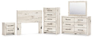 | Details | B2310-87: Made with engineered wood (MDF/particleboard/plywood) and decorative laminate for the right balance of affordability and durability, Rustic white finish over replicated reclaimed oak grain with authentic touch, Decorative laminate replicates natural or man-made material surfaces with consistent color, pattern and texture, ¼" bolts (not included) are needed to attach headboard to your existing bed frame, Minor assembly required, B2310B1: Made with engineered wood (MDF/particleboard/plywood) and decorative laminate for the right balance of affordability and durability, Rustic white finish over replicated reclaimed oak grain with authentic touch, Decorative laminate replicates natural or man-made material surfaces with consistent color, pattern and texture, Handles with dark pewter-tone finish, 6 smooth-gliding drawers, Drawer interiors are lined with a faux linen laminate for a clean, finished look, Framed front and pilasters, Safety is a top priority, clothing storage units are designed to meet the most current standard for stability, ASTM F 2057 (ASTM International), Drawers extend out to accommodate maximum access to drawer interior while maintaining safety, Mirror attaches to back of dresser; can also be mounted on wall horizontally or vertically , Minor assembly required, B2310-46: Made with engineered wood (MDF/particleboard/plywood) and decorative laminate for the right balance of affordability and durability, Rustic white finish over replicated reclaimed oak grain with authentic touch, Decorative laminate replicates natural or man-made material surfaces with consistent color, pattern and texture, Handles with dark pewter-tone finish, 5 smooth-gliding drawers, Drawer interiors are lined with a faux linen laminate for a clean, finished look, Framed front and pilasters, Safety is a top priority, clothing storage units are designed to meet the most current standard for stability, ASTM F 2057 (ASTM International), Drawers extend out to accommodate maximum access to drawer interior while maintaining safety, Minor assembly required, B2310-92: Made with engineered wood (MDF/particleboard/plywood) and decorative laminate for the right balance of affordability and durability, Rustic white finish over replicated reclaimed oak grain with authentic touch, Decorative laminate replicates natural or man-made material surfaces with consistent color, pattern and texture, Handles with dark pewter-tone finish, 2 smooth-gliding drawers, Drawer interiors are lined with a faux linen laminate for a clean, finished look, Framed front and pilasters, 2 slim-profile USB charging ports, Power cord included; UL Listed, Minor assembly required, | |