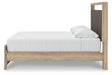 The natural wood tones and clean lines of this king upholstered platform bed echo your easygoing style sensibilities. With a warm finish and replicated oak grain, its carefree character lightens up your bedroom. Curved inner corner details soften the look, while contrasting brown fabric modernizes the feel. And for added function, warm LED lighting adds serene ambiance at the touch of a button.