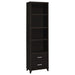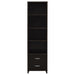 Elevate your living room with this four-piece entertainment center, finished in rich cappuccino for a sleek contemporary look. The 60-inch TV console accommodates televisions up to 60 inches and includes two framed clear tempered glass doors, adjustable shelving, and three drawers for organized storage. Flanking media towers provide additional open shelving for books and decor, along with two drawers each for concealed items. A connecting bridge tops the unit, featuring two enclosed compartments to complete the design. Brushed silver hardware and tapered legs add refined finishing touches.