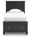 Details Includes panel headboard, storage footboard with roll slats and rails , Made with hardwood solids, birch veneer and MDF substrate, Side rails feature laminated solid hardwood slat support rails (or LVL) with glued and screwed blocking for added strength, Black painted finish, Round metal drawer knob with satin nickel-tone finish, Smooth-gliding drawer with ball-bearing side glides in footboard, Tapered feet, Bed does not require additional foundation/box spring; accommodates most zero clearance adjustable bases with the addition of a bunkie board, Mattress available, sold separately, Assembly required