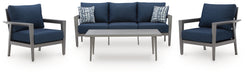 This outdoor collection brings comfort and can’t-miss style to alfresco entertaining. Create a cohesive seating arrangement with the included sofa, chairs and coffee table. The set’s durable aluminum frames in a sleek pewter tone withstand the elements to provide the longevity you need. And with easy-to-clean, UV-resistant Nuvella® fabric, it keeps its good looks as you soak up the sun.