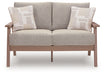 Natural neutrals are all the rage. Embrace the style trend with this outdoor loveseat. Crafted with MEGA-TUFF™ HDPE material, this chair combines the exceptional durability and weather resistance you need with the wood look you love. Comfy cushions wrapped in our high-performing, low-maintenance Nuvella® fabric offer stylish and durable appeal, taking outdoor living to a whole new level. Coordinating accent pillows add a wonderful layer of interest.