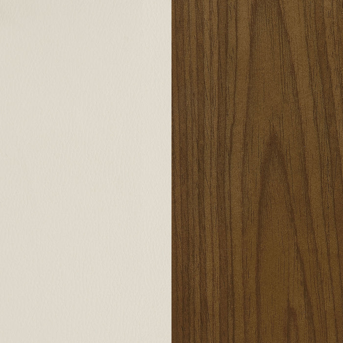 • Enjoy a lush palette with ecru leatherette upholstery and walnut and chrome trim