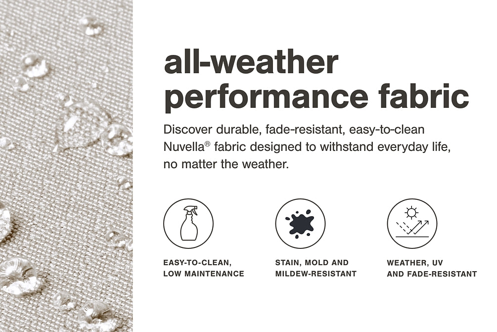 | Details | Includes 5 modular outdoor lounge chairs, Aluminum frame, Solution-dyed high-performance fabric, Nuvella® is an outdoor fabric that can be cleaned and offers UV resistance, Stainless steel hardware, Designed to withstand the harsh elements of the outdoors, Cushioned seat, Back cushion included, Includes PVC protective weather cover, Clean fabric with mild soap and water, let air dry; for stubborn stains, use a solution of 1 cup bleach to 1 gallon water | |