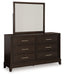 Details B618B5: Includes upholstered panel headboard, panel rails and panel footboard with slats, Made with hardwood solids, engineered wood and MDF substrates, Grayish brown wood-tone finish, Floating inset upholstered panel in polyester Next-Gen Nuvella fabric surrounded by LED backlight, Next-Gen Nuvella™ is a performance fabric that is soft, easy to clean, stain-resistant and durable, Clean fabric with mild soap and water, let air dry; for stubborn stains, use a solution of 4 oz. bleach to 28 oz. water, Light switch is located on each side of headboard and includes dual USB charging port (USB-A and USB-C), Power cord included; UL Listed, Foundation/box spring required, sold separately, Mattress available, sold separately, Assembly required, B618B1: Includes dresser and mirror, Made with hardwood solids, engineered wood and MDF substrates, Grayish brown wood-tone finish, Metal bar pulls with satin nickel-tone finish, 6 smooth-gliding drawers with dovetail construction and heavy duty ball-bearing side glides (top drawers felt lined), Mirror attaches to back of dresser, B618-46: Made with hardwood solids, engineered wood and MDF substrates, Grayish brown wood-tone finish, Metal bar pulls with satin nickel-tone finish, 5 smooth-gliding drawers with dovetail construction and heavy duty ball-bearing side glides (top drawers felt lined), B618-92: Made with hardwood solids, engineered wood and MDF substrates, Grayish brown wood-tone finish, Metal bar pulls with satin nickel-tone finish, 2 smooth-gliding drawers with dovetail construction and heavy duty ball-bearing side glides (top drawers felt lined),