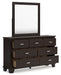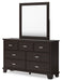 | Details | Includes dresser and mirror, Made with hardwood solids, engineered wood veneer and MDF substrates, Dark brown finish, Metal bar pulls with bright nickel-tone finish, 7 smooth-gliding drawers with dovetail construction and metal center guides, Drawer interiors are lined with a wood grain laminate for a clean, finished look, Top moulding on dresser, Mirror attaches to back of dresser | |