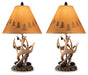 Details Set of 2 table lamps, Richly rustic base crafted of poly resin, Paper silhouette shade with decorative design, Each table lamp takes 100-watt max bulb or LED equivalent; UL Listed, On/off pull chain switch, Clean with a soft, dry cloth, Assembly required