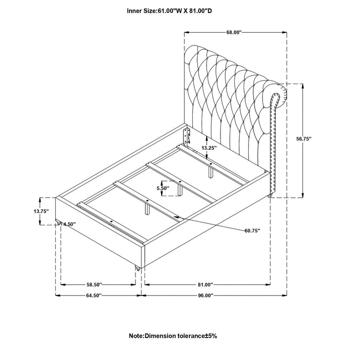 • Upholstered Chesterfield-inspired queen bed frame with timeless tufted headboard