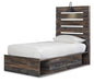 Details Includes headboard, footboard, platform rails, side storage unit and wood roll slats, Made of engineered wood (MDF/particleboard) and decorative laminate, Brown rustic finish with burnt orange and teal accents in a replicated wood grain with authentic touch, 4 drawers and 4 open cubbies that each accommodate 10.5"W x 10.5"D x 11"H cube storage bin (not provided), 2 decorative sconce LED lights, each runs on 3AA batteries, 2 USB charging ports, Power cord included; UL Listed, Bed does not require additional foundation/box spring; accommodates most zero clearance adjustable bases with the addition of a bunkie board, Dark-tone industrial hardware, Assembly required, Small Space Solution, Mattress available, sold separately