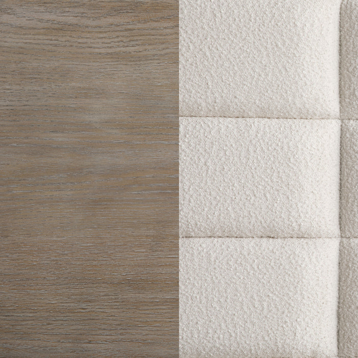Approachable style infused a modern four-piece bedroom set that centers on a striking upholstered bed. In cream with grid style tufting, the bed presents with a tall headboard and low footboard, creating an open, airy look and feel. A eight-drawer dresser includes a framed mirror, creating a stylish and functional top perfect for everything from morning rituals to decor that adds personality. The set adds a two-drawer nightstand with a shelf, creating ample space for personal items, decor, and a reading lamp at your bedside. The set is complete with taupe oak wood finish that's soft and neutral to complement a wide variety of linen and decor choices.
