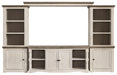| Details | Includes TV stand, 2 pier cabinets and bridge, Made of pine wood, pine veneer and engineered wood , Two-tone distressed finish: weathered gray top; vintage white base, TV stand with 2-door cabinet with single-shelf storage and 2 open shelves, Each pier cabinet with 2 fixed shelves and cabinet with single-shelf storage, Aged iron-color hardware, Cutouts for wire management, Assembly required | |