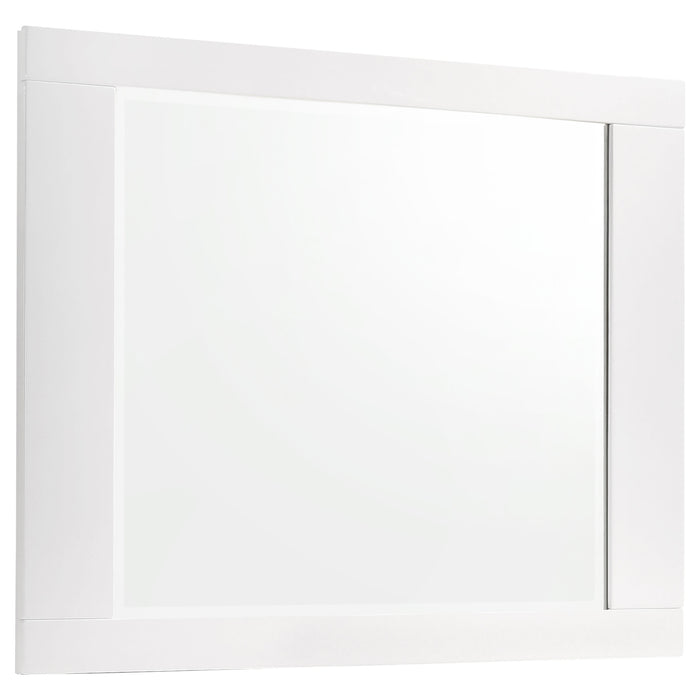 Bold and modern, this five-piece bedroom set is ideal for a contemporary home. It comes complete with a bed, nightstand, chest, dresser, and mirror to effortlessly complete your space. Each piece is coated in white polyurethane with a beautiful, high-gloss finish. Shining chrome accents add a dazzling hint of polish. With a sleek design and quality craftsmanship, this set is a stylish choice.