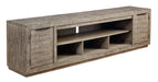 This extra-large TV stand is sure to win your heart with its daring take on modern rustic expression. Its crisp, clean minimalist-chic profile is enriched with striking pine wood grain and a weathered gray finish with distressed saw mark texture. Designed to turn your home theatre room into a style statement, the large center media cabinet can be removed for use with the optional W100-22 electric fireplace (sold separately).