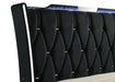 • LED-lit wingback bed with tufted crown and sculpted sides creates a dramatic focal point