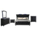 • Bedroom set upholstered in a black velvet with quilted fronts and soft sheen
