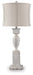 This table lamp takes a classic approach to tasteful lighting. Its detailed base ushers an air of elegance into your space with a graceful turn design. Outfitted with an antiqued white finish, it's right at home in traditional spaces. Pair with the matching floor lamp (sold separately) for double the style.