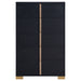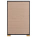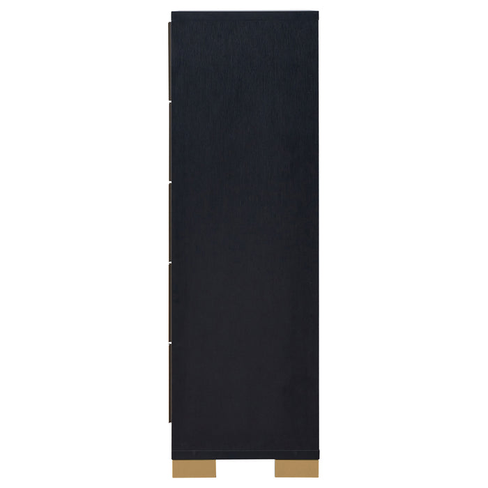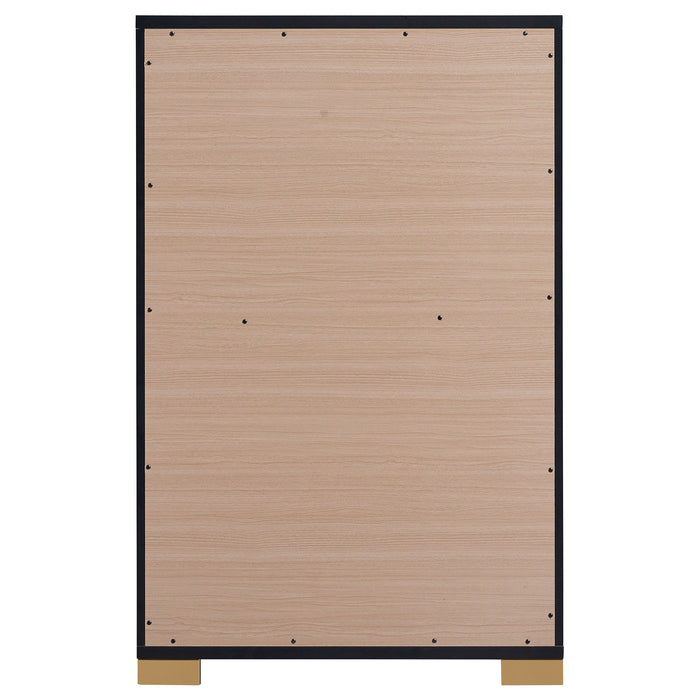 Minimalism never looked so elegant as it does in this elegant five-drawer chest, an excellent option for your updated bedroom ensemble. Modern design details produce a chic vertical chest with an Art Deco vibe and tons of storage space. Made of wood products, this five-drawer chest features a versatile finish with accenting from gold finish metal, placed carefully to emphasize a geometric linear effect. Store incidentals and accessories in drawers operating smoothly on center metal glides. English dovetail drawer construction embellishes this chest’s quality, as vertical gold metal drawer hardware offers a unique impact.