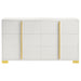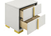 Cool white and warm gold create a compelling, modern ambiance for a stylish contemporary bedroom set. Centered on clean-lined silhouettes, the set features a modern bed complete with a squared headboard with built-in LED lighting that creates the right mood for relaxing evenings. The light is operated with a touch switch on each side of the headboard, assuring it's in easy reach. Storage pieces add roomy drawers with vertical gold pulls, and the dresser is topped in a framed mirror that adds to the airy feel of this set. Bracket feet complete the set, offering reliable stability and just the right hint of modern glam sophistication.