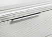 Maximize your bedroom storage with this stylish 5-drawer chest, featuring a modern Italian design. The white finish and picture framed recessed panels with embossed herringbone graphic patterns create a sophisticated look. Accented with mirror framing, acrylic legs, and polished chrome metal hardware, this chest offers ample storage space. Crafted from rubberwood, MDF, and mirror, this chest combines style and practicality, making it a perfect addition to your luxurious bedroom.