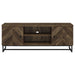 This rustic TV console offers a modern touch to a farmhouse style living room. A rustic oak finish showcases the classic herringbone pattern across the double cabinet doors. Supported on a metal trestle base in a gunmetal finish that offers an industrial flair, this TV console offers plenty of support while lifting the furniture piece over a rug and offering extra space beneath for baskets and organization. Inside each cabinet is a single adjustable shelf that may be lowered or raised as needed. In the center of this console are two open shelves for a gaming console and other entertainment systems.