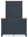 | Details | B414-57: Made with hardwood solids, mindi wood veneer and MDF substrates, Two-tone finish features a dark slate blue with a light brown wood-tone top, ¼" bolts (not included) are needed to attach headboard to your existing bed frame, Assembly required, B414B1: Includes dresser and mirror, Made with hardwood solids, mindi wood veneer and MDF substrates, Two-tone finish features a dark slate blue with light brown wood-tone top, Nickel-tone metal knobs, 6 drawers with fully finished interior, dovetail construction and heavy duty ball-bearing side glides, Mirror attaches to back of dresser, | |