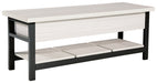 Seating with style and storage—what more could you need? This storage bench has a hinged seat and plank shelf, making it the perfect multi-use piece. The white wood grain effect lends a casual touch, while the black finished legs and supports create a dynamic contrast.