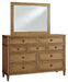 Taking a timeless approach to bedroom beauty, this dresser with mirror brings easygoing elegance to the everyday. With its light brown wood tone, it seamlessly slips into your room’s aesthetic. Dark bronze-tone pulls accent the assorted storage drawers, adding to this dresser's fresh approach to transitional stylings.