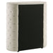 • Coordinating case pieces feature velvet upholstery with vertical stitching and crystal accents