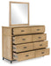 | Details | Includes dresser and mirror, Made with hardwood solids, mango wood veneer, MDF substrates and metal, Light brown wood-tone finish , Gunmetal gray finish on metal legs, Metal bar pulls, 8 drawer with fully finished interior, dovetail construction and heavy duty ball-bearing side glides (top drawers felt lined), Mirror attaches to back of dresser, Assembly required | |